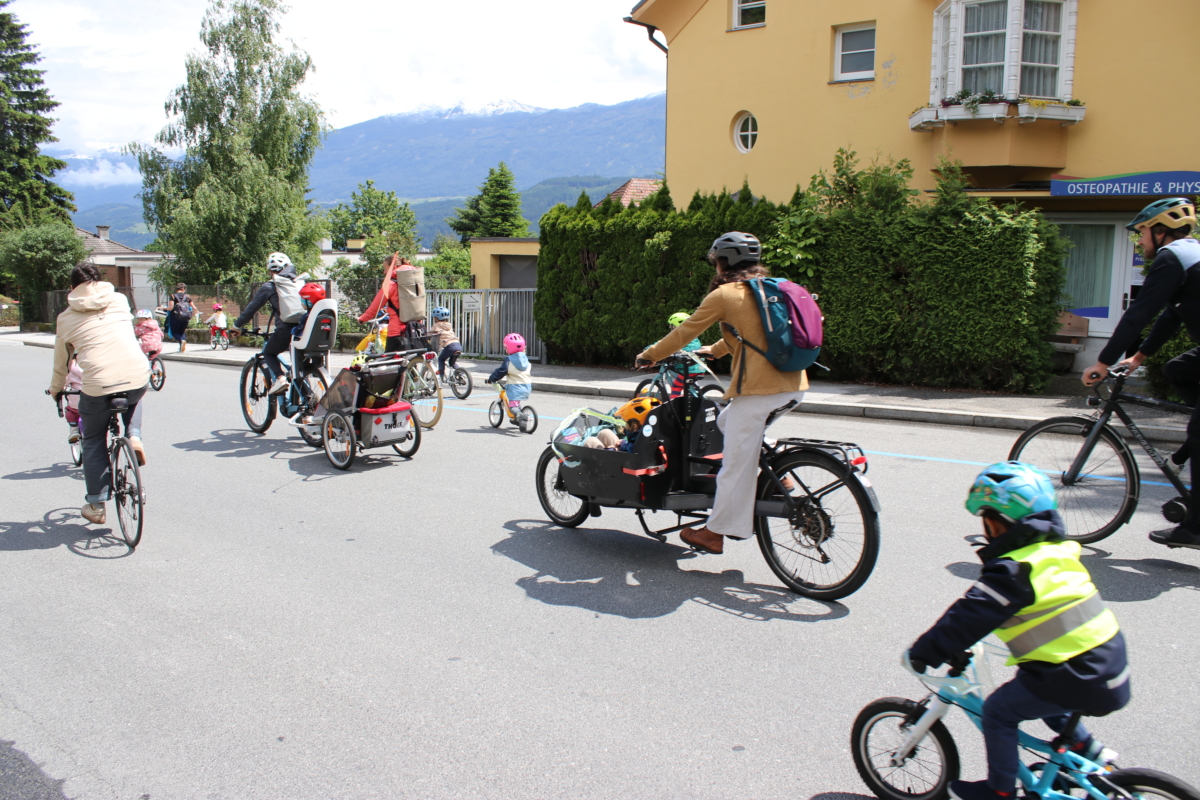 Der Bike-Bus fördert aktive Mobilität von Anfang an. In Kössen radeln die Kinder täglich gemeinsam mit Erwachsenen zur Schule. Dieses organisierte, begleitete Radfahren steigert nicht nur die Bewegung der Schüler*innen, sondern auch ihre Sicherheit auf dem Schulweg.