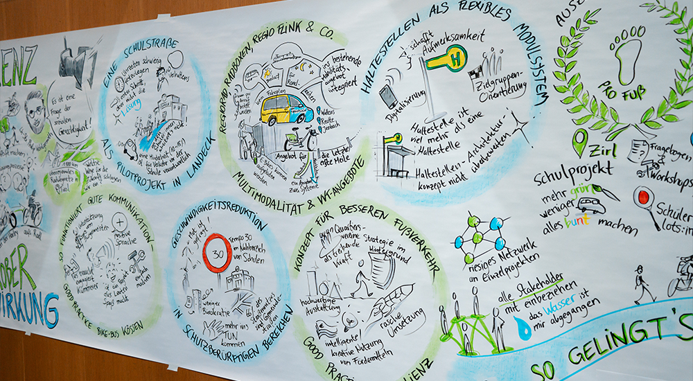 Nicolas Bleck hat die Mobilitätskonferenz visuell festgehalten und ein Bild gezeichnet, was die wichtigsten Kernbotschaften des Nachmittags waren.
